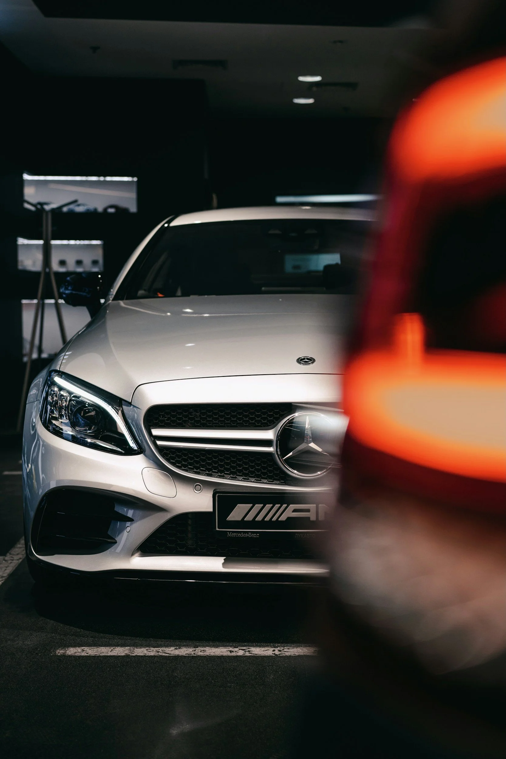 A white Mercedes-Benz car parked indoors, partially obscured by a blurred red vehicle to the right.